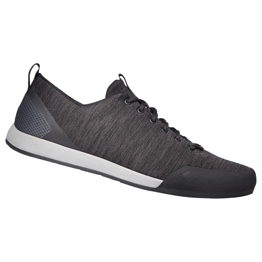 La tige est agréablement respirante, évitant ainsi que la transpiration ne s’y accumule. De plus, elle est très solide. La semelle antidérapante est en caoutchouc BlackLabel-Street signé Black Diamond. Elle garantit une bonne adhérence sur tout type de sol. C’est idéal en approche. Le renfort au niveau des orteils apporte une protection supplémentaire contres les graviers. La semelle intercalaire moulée offre un confort optimal et un bon amorti. Les lacets souples permettent d’ajuster individuellement les chaussures. Les boucles servent à attacher les chaussures à un baudrier d’escalade. Le talon est rabattable, ce qui est très pratique pour transformer rapidement les baskets en chaussons pour les utiliser en salle d’escalade. Les chaussures Circuit Shoes vraiment polyvalentes et faites pour les grimpeurs !